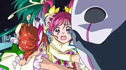 | さらわれたりんたちをたすけるため、のぞみたちはナイトメアのほんぶにむかったの。 そこでみたものは、ぜったいにはずれることのない「ぜつぼうのカメン」をかぶせられたりんたち。 そしてのぞみもドリームにヘンシンしたとたん、「ぜつぼうのカメン」をおしつけられてしまった! ドリームたち5人は、くらくぶきみなおとしあなにおちていき・・きがつくと、パラレルワールドにいたわ。 つらいげんじつをわすれ、たのしくておだやかなセカイにひたっているの。 でものぞみは、ココがつくったスズつきのキーホルダーでげんじつをおもいだす。 たのしいだけじゃダメ、これからのためにいまをがんばらなくっちゃ! するとなんとドリームのカメンがくだけたの! ドリームたちは、パラレルワールドをぬけだすことにせいこうし、5にんはあらたなチカラをてにいれる・・! |