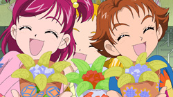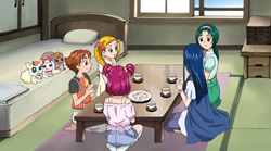 | わがしやをしているこまちのいえは、なつまつりにまいとしでみせをだしているんだ。 ことしはこまちがかんがえた「スペシャルカキゴオリ」をうることになったの! ようかん、あんみつ、あんこをのせたとってもおいしそうなカキゴオリなんだ☆ でもおまつりのひ、とどいたコオリをガマオにぜんぶたべられてしまったの! あわててこまちはもういちどコオリをちゅうもんするんだけど、もうまにあわなくて・・。 あきらめかけるけど、かれんにせっとくされて、ふたりでたくさんのメーカーにでんわをしたの。 でもコオリがのこっているかいしゃはみつからない。 そんなときのぞみのことばをヒントに、コオリのかわりにナツミカンをつかってフルーツアラモードをつくることをひらめいたんだ! でもまたガマオがじゃまをしにあらわれて・・! |
