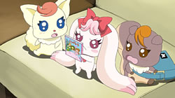 ミルクはしょうせつをかくために、こまちにシンデレラのえほんをかりたの。 ひとりでへやにこもってさっそくかきはじめたミルクは、あることをおもいつくんだ。 あるところにのぞみにそっくりなシンデレラと、すがたはこまちにそっくりだけど「いじわる」なおかあさんと、りんとかれんにそっくりなおねえさんがすんでいたの。 でもシンデレラはなんどもころんでて・・こんなふうにストーリーをかいていると、のぞみがミルクのようすをみにやってきたの。 |