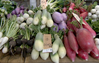 鎌倉で栽培した朝獲り野菜がずらりと並ぶ。各売り場には、生産者名と住所、電話番号が書かれた札があるので、お目当ての農家を訪ねて、市内外からたくさんの人が買い付けに来る。