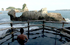 船でしか行くことができない、海が目の前の露天風呂。海岸崖下の岩場に温泉があるため「釣り船」に乗って向かう(往復1500円)片道5分の船旅。