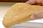 定義名物「三角あぶらあげ」のお店。町外れにある豆腐屋さんの前には揚げたての油揚げを求め行列ができる。醤油と唐辛子をかけて出来立てを食べる。