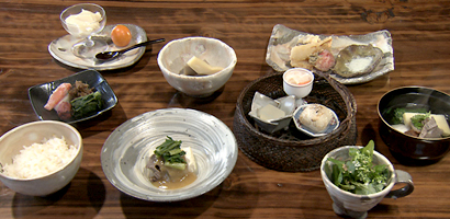 美しい棚田の風景を眺めながら、地元の幸を盛り込んだ創作料理と高千穂牛が楽しめる。