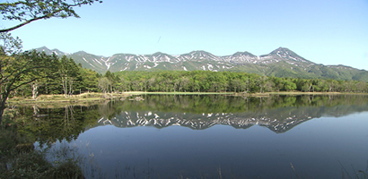湖面に映る知床連山の美しさは圧巻。エゾシカやエゾリスなど野生動物との出会いも楽しめる。