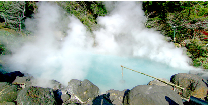 約1200年前の鶴見岳の爆発で出来た海地獄には、1日に約150万リットルもの源泉が湧いている。池の色が青く透き通っているのは、温泉中の成分である硫酸鉄が溶解しているため。