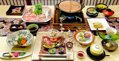 明治時代に建てられた建築と山形の職人が手がけた調度品が見事に融合している。夕食は山形の食材を使った料理が豊富に揃い、味はもちろん見た目も美しい。