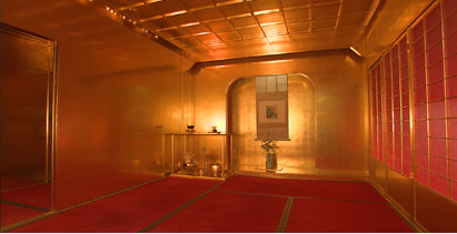 店内では箔打ちの実演や約4万枚の金箔を使用した黄金の茶室を見学することが出来る。
