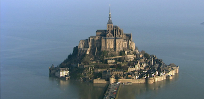 フランス北西部、セーヌ川の下流域にあたるノルマンディー地方の世界遺産。海岸線から1キロほど沖に突き出た岩山で、フランスでもっとも有名な巡礼地。堤防からラヴァンセ門をくぐり進むと、みやげ物店、オムレツが名物のレストラン、ホテルなどが軒をつらねる参道グランド・リュー(Grande Rue)が修道院までのび、数多くの観光客でにぎわう。ヨーロッパ最大の干満差が観測され様々な表情を楽しめる。