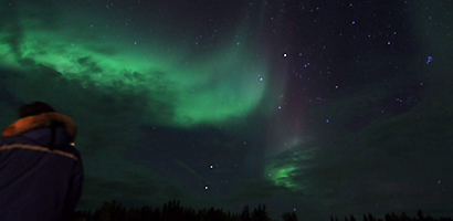 オーロラが見えることで世界的にも有名な町『イエローナイフ』。その中でも、特にオーロラがよく見える場所にあるのがオーロラビレッジ。伝統的な先住民の住居『ティピ』というテントの中で、オーロラが出るまでの時間を快適に過ごせる。秋は、キャメロンフォールズへのハイキングや野生のバッファローを見るツアーが人気。