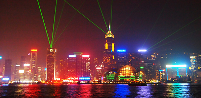 毎晩8時から行われるビルのライトアップショー。香港島、九龍に立ち並ぶビルが参加し、音楽に合わせた光のショーが行われる香港の名物。