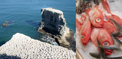オークランド市内から車で約40〜50分、野生のカツオドリの群生地が簡単に見られる観光名所。数千羽のカツオドリは8月〜3月が見ごろ、5月でもその姿を見ることができる。巨大な砂丘が点在する黒砂のビーチは壮大な景観で荒々しい波が打ち寄せ、サーファーたちが巨大なうねりを目指し果敢に挑んでいる。
