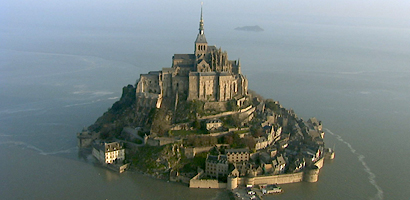 フランス北西部、セーヌ川の下流域にあたるノルマンディー地方の世界遺産。海岸線から1キロほど沖に突き出た岩山で、フランスでもっとも有名な巡礼地。堤防からラヴァンセ門をくぐり進むと、みやげ物店、オムレツが名物のレストラン、ホテルなどが軒をつらねる参道グランド・リュー(Grande Rue)が修道院までのび、数多くの観光客でにぎわう。ヨーロッパ最大の干満差が観測され様々な表情を楽しめる。