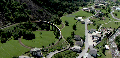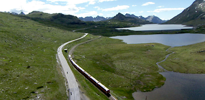 メインルートとして、サン・モリッツとイタリア領のティラーノを結ぶベルニナ線を走るパノラマ列車。アルプスの峠を越えて、イタリアの葡萄畑が広がる素朴な谷まで、高低差が約1800mという起伏あるルートをわずか約2時間でかけ抜ける。雄大な氷河や美しい森や滝、4000m級の名峰が連なるベルニナアルプスなど、感動的なアルプスの山岳風景が車窓に次々と展開する。高低差を調整するための、ブルージオのオープンループ橋が有名。サン・モリッツ=ティラーノまでのベルニナ線とトゥージス=サン・モリッツまでのアルブラ線は2008年世界遺産に認定された。