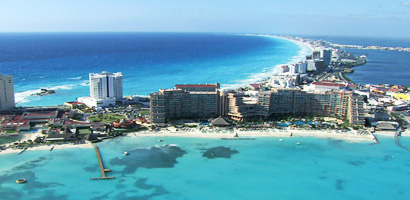 カリブ海に臨む世界屈指の高級リゾート地。ユカタン半島の北東部にある。年間晴天日は約200日を超し、美しい海とビーチを背景に、世界各国から観光客が集まる。カリブ海とラグーンに囲まれた砂州には、100余りのホテルが建ち並ぶ。