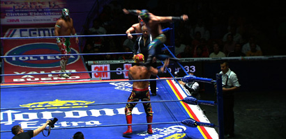 ショーアップされたメキシコスタイルのプロレス。メキシコ庶民最大の娯楽として人気を博しているという。空中技やスピード感のある技に目が離せない。