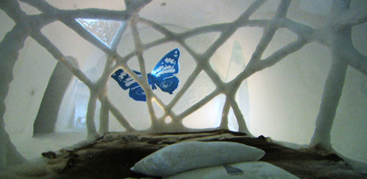 世界初の氷のホテル。屋根・壁・ベッドなど、部屋も家具もすべて氷で造られている。