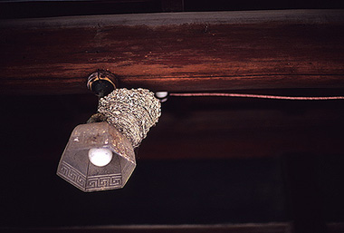 感電しなかったかな、なんてつい心配する。 古い電灯の傘が、重い巣を背負わされたために、 バランスを失ってしまっている。 でも電灯は、迷惑そうな顔しながら、 本当はとても嬉しいのではないだろうか。 私には、なんだかその気持ちがよく分かる。 懐の深い玄関で出逢った、気になる風景だった。