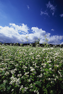 朝まで雨雲が残っていたこの盆地に、 秋らしい青い空がのびて来た。 目の前のそばの白い花が、 気持ち良さそうに風に揺れている。 この突き抜けるような空気を思いっきり吸い込んでみよう。 初秋の風が運んできた青い空と澄んだ空気。 それはまた、優しい気持ちまで運んできてくれたのだった。