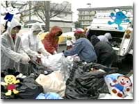| アルミ缶の回収に収集車がやってきました。PTAのお母さんたちがアルミ缶の回収を手伝います。みんなは、その様子も必ず見学するそうです。アルミ缶を持ってくるだけではなくて、リサイクルの勉強もしようというわけですね。みんなががんばったおかげでずいぶんたくさんのアルミ缶が集まりました。 |