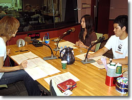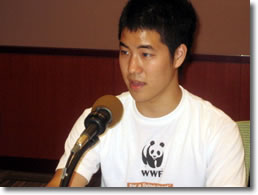 for the Future(未来への航海)」というプログラムを行いました。カナダ、ドイツ、アメリカ、イギリス、ロシア、オランダ、スウェーデン、ノルウェー、そして日本の9カ国から集まった18人の学生が船に乗り込み、北極海に浮かぶ島、ノルウェー領スバーバル諸島を目指しました。これは学生達が北極海を旅することで感じた地球温暖化の現状を、洞爺湖でのG8サミットに参加する世界の政治家達に伝えることを目的としたものです。そのクルーズに参加された高木俊太さんと村上由里子さんをお招きしました。まずは自己紹介をお願いします」高木「法学部、法律学科の1年生です」村上「英語、英文学を専攻しています」