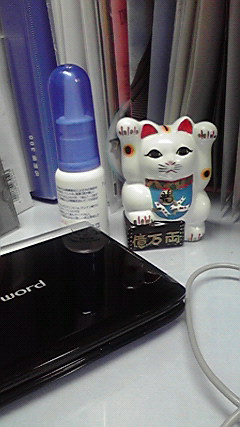 ■写真は艦長の机の上の3点セット。電子辞書、点鼻薬、招き猫のある風景です■最近はインターネットの影響であんまり辞書が使われなくなってきたような気がするのですが...確かにあの検索エンジンとか、ウェブ上の百科事典みたいなやつの能力はすごいですよね。なんというか、人間と情報の関わり方の仕組みがここ数年で全く変わってしまったという気がします。世界中のことがクリッククリックで何でもわかっちゃう気になるもんなあ...■例えば、若いディレクターや放送作家数人と打ち合わせをしたりすると、たいてい中に1人はノートパソコンを常時手放さない人がいて、話の中で疑問が出るとすぐにネットで検索して答えを出しちゃう。アイドルの出身地から世界情勢まで、ね。うん、これって確かにすごい。僕も頻繁に利用しますし感謝もしてます■でも、やはり「辞書」は必要ですよね。...ってだったら電子辞書じゃなく、ちゃんと分厚い書物の辞書を買えよって話ですが、この中に何十冊分の知識が入ってるってのもすごいし、大体部屋も狭いしね■点鼻薬は、子供の頃から蓄膿症で花粉症もベテランという、年中鼻水鼻づまりに悩まされている僕には手放せない一品。枕元、かばんの中、デスクトップ...と何本も持っております■そして、両前脚を上げた招き猫。招き猫の手は、右を上げると人を招き、左を上げると金を招く。両方は欲張りすぎでよくないとされていたそうですが、最近はそうもいってられないのか、こういうのも増えたそうです。自分で買ったんじゃありません。実はちょっとした思い出の品なんですが...その事情は秋になったら電撃的に発表しますので待っててね。誰も待ってないとは思いますが、驚くべき話なんですよ、これが...(艦長)