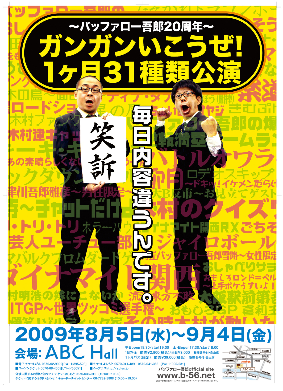 さて、年代的には私よりも若干下の世代なのですが、この2009年夏、甲子園球児たちよりも熱く、サマソニに出演するアーチストよりヒートアップしそうなのがバッファロー吾郎さん。20周年を記念して「ガンガン行こうぜ!1ヶ月31種類公演」(8月5日~9月4日)を挙行されます。毎日違う内容のライブなんて凄いとしかいうほかありません。「草食系男子」の価値観からすると真夏はエアコンの効いた部屋で世界水泳を見て涼しく過ごすのが正解なのでしょうが、夏休みの1日くらいはABCホールに足を運んでみてはいかがでしょうか。
