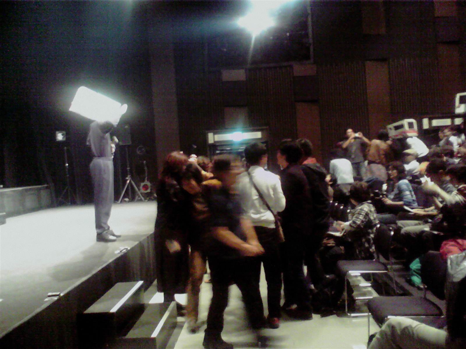 昨日大好評のうちに無事終了した福岡の劇団・ギンギラ太陽'sの『翼をくださいっ!さらばYS-11』。開演15分前から場内で強制写真撮影会が開かれます。僕が勝手にお客様の顔を写すのもなんなのでこんな写真ですが、客席では、西鉄バス軍団とお客様のツーショット、グループショットがバシバシ撮られまくってます。是非、早目に来場してくださーい。