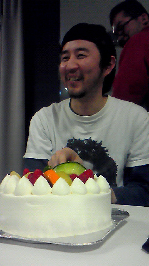 IMG_0285.jpg 昨夜。『決戦!!ひなた荘』小屋入り前の最後の稽古終了間際の出来事です■BG編演出の劇団赤鬼・川浪氏が、突然スタッフに妙な指示を出します。すると、かわいいケーキが稽古場に出現。この期に及んで新たなシーンの挿入!?それにしても別に本物のケーキ使わなくても。・・・とか思ってると、そのケーキはキョトンとしているお~い!久馬さんのもとへ。そして全員から『おめでとうございます!』のお祝いの声が・・・。