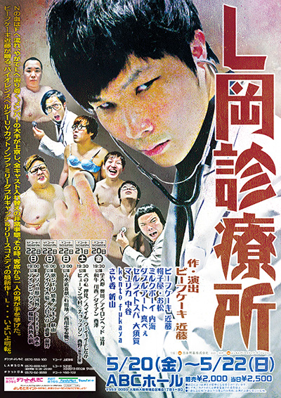 ■ビーフケーキ近藤企画『L岡診療所』、今日初日です■ビーフケーキはよしもと所属のお笑いコンビ。NSC27期卒業生で、コントを専門にやっています。関西にはかなりの数の若手お笑い賞レースがありますが、ビーフケーキは「いつでもいいとこまで行くんだけど、一等賞に届かない」存在です。今までに2回、ABCホールで単独ライブを開催したことがあり、僕もその時に初めて作品を拝見したのですが、いっぺんに好きになりました。もちろんコントですからお笑いなんですが、舞台に一種の陰影、哀愁、のようなものが漂っている。関西では定番の「なんでやねん!」みたいな声を張り上げる突っ込みもなく、二人の奇妙な関係、行為がかなり演劇的に淡々と提示される・・・。すごく僕好みなのですが、正直、今のテレビのネタ番組では彼らの魅力は伝えきるのが難しいのかな、とも思います■20年ほど前でしょうか、ある落語の大師匠が、20代の千原兄弟に向かって、「あんたら面白い。面白いけど、ハリウッド映画やのうてフランス映画の面白さやねんな」とおっしゃるのを聞きました。「シングルよりアルバムが売れるタイプのミュージシャン」とも評された記憶があります。当時の千原兄弟は、センスと実力は多くの人が認めるものの、テレビの枠の中にはなかなか収まらない存在でした。僕はビーフケーキが何となく、芸風やコント師としての立ち位置において、彼らに近しいものがあると思うのです。キャラは全く違いますけど・・・■さてそんなビーフケーキでネタ作りと主にボケ役を担っている近藤貴嗣くんは、最近自らのプロデュース・作・演出で演劇公演を頻繁に行っていて、今回初めて当ホールで公演を行う運びとなりました。実は僕、前から行かねば行かねばと思いつつこの近藤芝居を拝見したことがないのですが、どうやらただの演劇ではなく大変な仕掛けがあるらしい■まず何人かの若手芸人たちが、近藤君が書いた台本をもとに稽古を重ね、一本の芝居を作ります。そして劇場に入り、いよいよ本番!・・・の約1時間前に、4人の先輩芸人が劇場にやって来るのです。「○時にABCホール入り」というだけでなにも聞かされていない彼らは、突然舞台衣裳を着せられます。依然として説明も挨拶も一切ありません。そして本番が始まってしばし後に、何も分からないまま舞台上に押し出され、お芝居に参加させられるのです。≪これ、いったいどんなハナシやねん!?≫・・・五里霧中の状態から手探りで芝居の流れを読み、展開を壊さないように、しかも芸人の本能として笑いもとりつつ、劇に参加する先輩芸人・・・。なんとも面白いことを考えたものです。近藤君曰く、このスタイルにおけるお客様の醍醐味は、「お化け屋敷に入って来た人がワーキャー怖がる様子を上から眺めて楽しむ」ようなものだそうです。なるほど■ビーフケーキ近藤企画『L岡診療所』、」今夜から5回、毎回4人の豪華なイケニエを迎えての上演です(艦長)