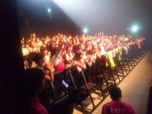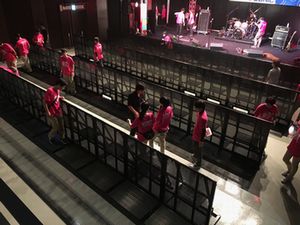 元々ABCホールは立見公演を想定していなかったのですが、2010年に消防に申請し、2015年に非常誘導灯を増設。可動式の1階席をロールバックして、531人の定員で立見のコンサートが可能になりました(通常の着席での定員は327人)。当日、バンドのリハーサル直前にバリケードを4列設置し、事前応募した若い音楽ファンが1階を埋め尽くしました。