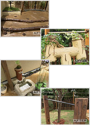 庭から撤去した木の幹と土壁の土は、門の手前の階段のリフォームに使用しました。