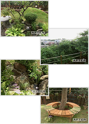 40坪近い広さがありながら、雑然としたまま子どもものびのびと遊ぶこともできなかった危険な庭が、リフォームでスペースを有効利用し、安全で美しい風景が広がる親子三人の憩いの庭に生まれ変わりました。