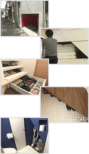 靴の収納は、玄関土間の下にも…このように数多く用意された玄関周りの収納で、リフォーム前には靴箱から溢れ出していた家族5人分の靴が余裕で収まるようになりました。