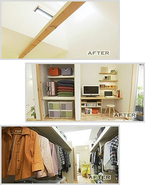 広々とした共用のウォークインクローゼットは、姉妹それぞれの部屋から行けるようになっています。収納力はなんとタンス4棹分!そこで着替えてすぐ出られるように階段に直接行き来できる3つ目の扉も作られました。