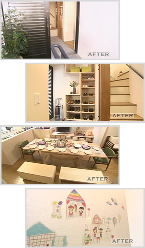新たな玄関は、大人数でも窮屈にならないように広い三和土になり、天井高いっぱいまである大容量の靴箱が設けられました。これで総勢12人が集まっても靴でいっぱいになることはないでしょう。腰を掛けて靴を脱ぎ履きできるベンチや、階段下に収納を設けてわずかなスペースも無駄にしません。