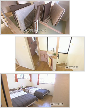 日当たりがよく、風通しも良い2階には室内でたくさんの布団が干すことができるようになりました。この布団干しの下にはレールが設けられていて、干した布団をそのまま押入れにしまえるようになっており、布団を出し入れする作業もずっと楽になりました。