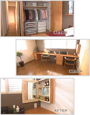 寝室の間仕切りの向こう側には、南向きの窓から明るい日差しが差し込む日当たりの良い書斎スペースが生まれました。壁いっぱいに伸びるカウンターデスクは、夫婦2人が並んで作業しても余裕の広さ。