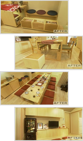 大人数で食事をする時のために造られたダイニングテーブルは匠オリジナル。 ロックを外し、天板を持ち上げると座卓が誕生。そして、その下の天板を取ると、さらに座卓がもう一つ。 最後に、先ほど外した天板を残った脚にのせると、4メートル以上もある大きな食卓になります。