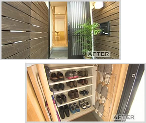 玄関は、下駄箱を壁に寄せたことで以前より、土間を広く使えます。扉の裏にもスリッパや傘を収納でき、上の段の扉にもシューズケアの小物などが仕舞えます。