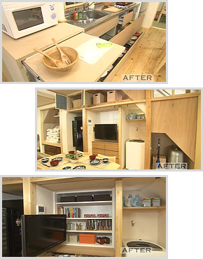 収納スペースの一角には、お母さんの家事動線を考え洗濯機が置かれました。その隣には、限られたスペースを活かす「匠」の知恵。テレビを回転金具で自在に動かせるようにし、背後のデッドスペースに収納棚を作りました。