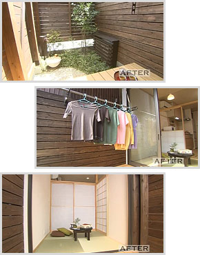 以前、物干し台があった場所は、杉板の柵で目隠しし、ヒノキの床板で一新。夫婦で寛げるおしゃれなバルコニーが誕生しました。