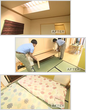 座卓は「匠」のオリジナル。押し入れの下、お母さんの嫁入り道具のタンスとの隙間にピタリと収まるように作られています。