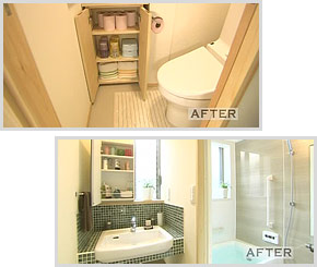 南向きの窓から光が注ぎ、風通しも良い風呂場と洗面脱衣所。浴槽は倍の大きさになり、ゆったり入れます。