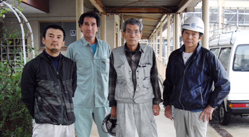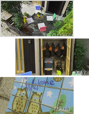 玄関へ上がる外階段の脇には、新しく可愛らしい表札が。 このふくろうの画は20枚のタイルで出来ていて、実はこれ、寮生たちの発案で、部員全員で作ったもの。 リフォームの記念になるものを先生夫婦に贈りたいという想いに応え、匠はこれを家の入口正面に飾りました。