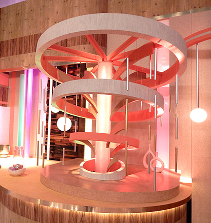 A英語でキャスト(CAST)は「投げかける」という意味があります。ニュースを分かりやすく視聴者に投げかける、視聴者目線の疑問をコメンテーターに投げかける・・・。そうして伝播していくようすを波紋の形で表現しました。セットには波紋をモチーフとしたリング状の造形を幾重にも配置しています。Q木目とピンクが印象的なセットですが、色味のこだわりを聞かせてください。