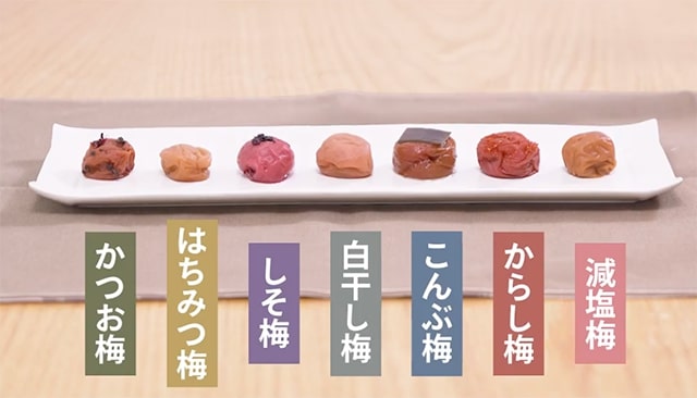 ひとくちに梅干しといっても、農家での生産工程や、工場での加工方法によって味や風味が異なります。「白干し梅(減塩含む)」「しそ梅」「はちみつ梅」などは特に有名ですが、「こんぶ梅」「かつお梅」のような出汁の効いたタイプや、「からし梅」のような変わり種もあります。