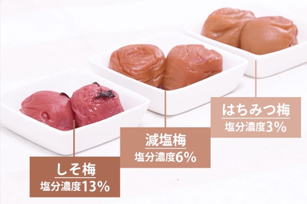 「しそ梅」は減塩梅やはちみつ漬けなどに比べて塩分濃度が高い傾向にあります。お弁当やおにぎり用に梅干しを選ぶときは、パッケージの塩分濃度表示を参考にしてみてくださいね。