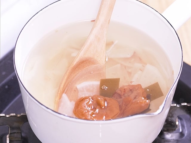 どんな梅干しでも効能には影響のない梅ながしですが、料理として美味しくいただくなら「こんぶ梅」が相性抜群です。細かい味付けをしなくても、昆布の出汁がほどよくやさしい味に整えてくれます。