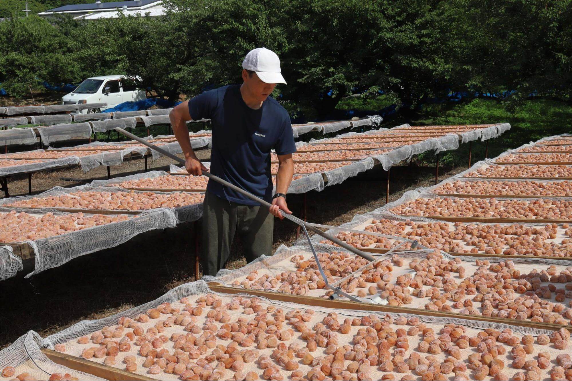 田辺市では、梅の栽培だけでなく梅干しをつくる工程も農家が担当します。柔らかい梅干しは熟した梅からしかできません。農家は熟して落下した梅を収穫し、その日のうちに塩で漬けます。1ヶ月程度じっくり漬けた後に天日干しをすると、梅干し(白干し梅)が出来上がります。