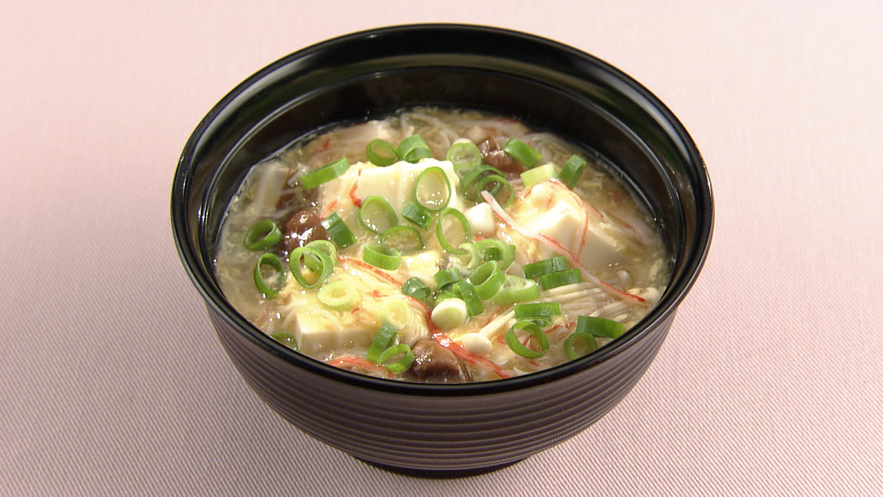 煮汁に水溶き片栗粉でとろみをつけ、溶き卵を流し入れてかにかまぼこを加える。